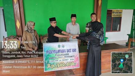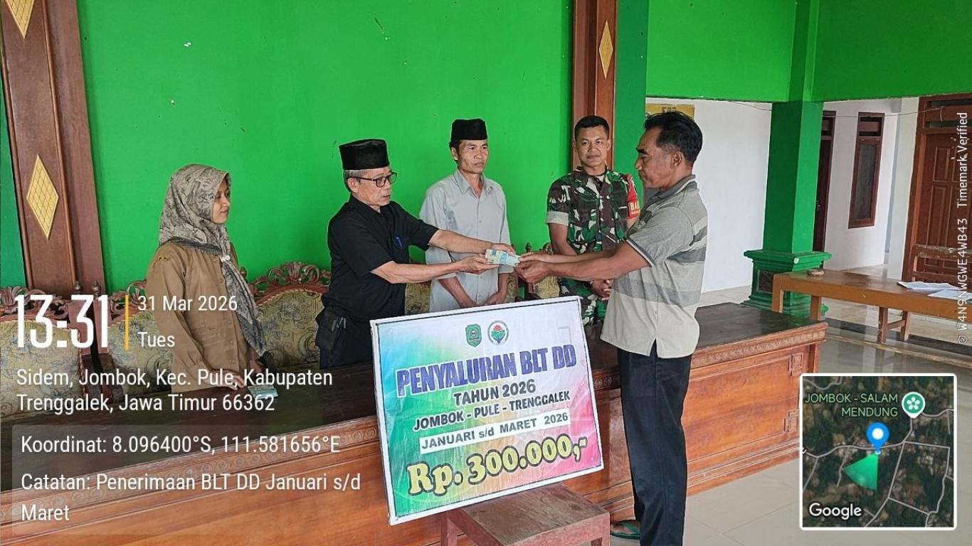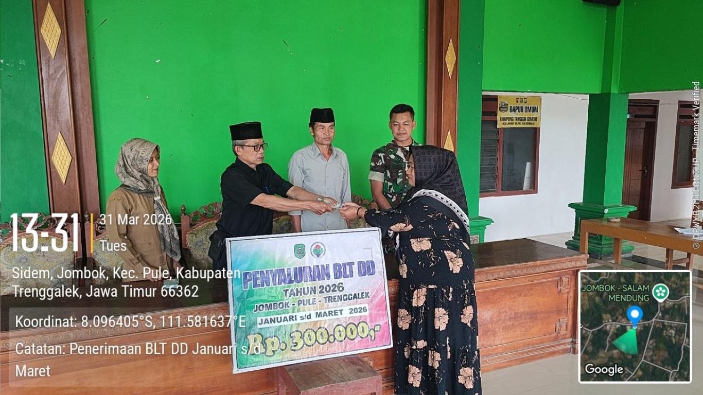 Selasa, 31 Maret 2026 Pemerintah Desa Jombok Kecamatan Pule Kabupaten Trenggalek melaksanakan penyaluran Bantuan Langsung Tunai Dana Desa bagian bulan januari sampai dengan maret bertempat di Balai Desa Jombok. Kegiatan ini dihadiri oleh Babinsa Desa Jombok, Perangkat Desa dan KPM Penerima Bantuan Langsung Tunai. Penyaluran diberikan secara langsung oleh Bapak Kepala Desa Jombok kepada 5 orang KPM.